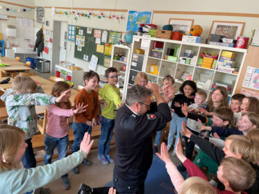 Heute hatte die Klasse 1c Besuch von der Polizei Weyhe. Herr Pistol hat mit seinem Begleiter Fabian mit den Kindern darüber gesprochen, warum Regeln wichtig sind und wofür wir sie in unserem Alltag brauchen. Außerdem haben die Kinder geübt, laut und stark „Stopp“ zu sagen. Nach ersten zögerlichen Versuchen war es dann so laut wie nie zuvor im Klassenraum …