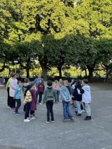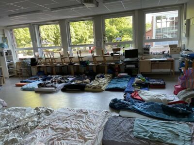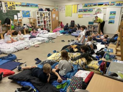 Nach dem Abendessen wurden alle Kinder gebracht und die Betten wurden im Klassenraum aufgebaut. Gemütlich sah es aus, aber geschlafen werden durfte erst ab 22h, so die Ansage der Lehrkraft. 🙂 Also ging es erstmal zum Spielen auf den Schulhof und anschließend wurde ein Escaperoom-Rätsel gelöst. Nach einer kleinen Stärkung im Abendlicht in der Pausenhalle, haben dann alle ihre Schlafsachen angezogen, Zähne geputzt und es ging mit und ohne Taschenlampe durch die dunkle Schule. Nach der Gutenachtgeschichte kehrte langsam aber sicher Ruhe ein und für alle ging es satt und zufrieden nach dem gemeinsamen Frühstück am nächsten Morgen nach Hause. Zum Glück gab es das lange Wochenende zum Erholen. 🙂