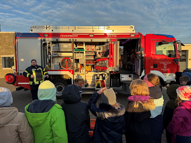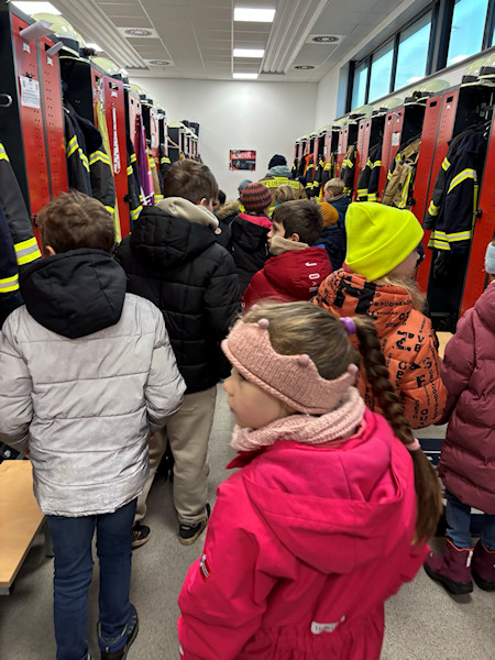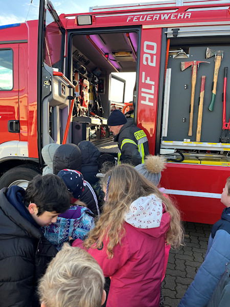 Bei herrlichem Wetter durfte der 3. Jahrgang am Montag die Feuerwehr besuchen. Zu Fuß machten sich die ca. 80 Kinder auf den Weg zum Feuerwehrhaus. Vor Ort warteten als Überraschung auch noch ein Rettungsfahrzeug und ein Polizeiauto mit jeweiligem Fachpersonal. Die Kinder bekamen einen Einblick in die Räumlichkeiten und Erklärungen zum Ablauf eines Einsatzes, zu Geräten und Ausrüstung und den Fahrzeugen. Als Höhepunkt durften alle Kinder mit dem Feuerwehrschlauch spritzen und einige konnten sich auch in die Fahrzeuge setzen.