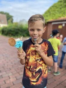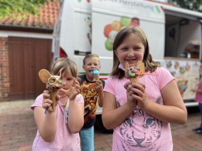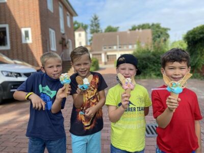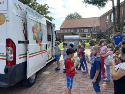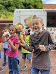 Na, das war aber eine Überraschung zum Schuljahresende: Jedes Kind der Schule durfte sich über ein Eis freuen. Nach einem sehr anstrengenden und ungewöhnlichen Schuljahr war der Besuch des Eiswagens genau das Richtige und eine leckere und erfrischende Abwechslung.