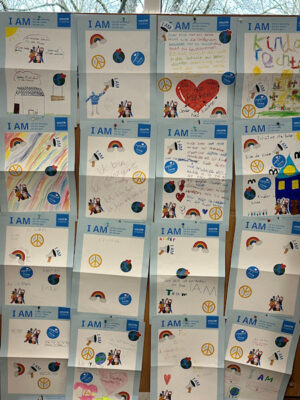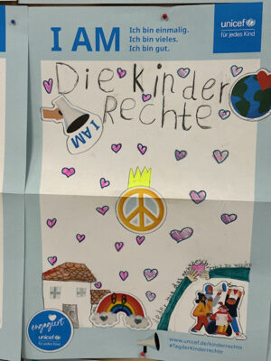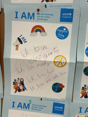 Im Rahmen des FREI DAYs haben die Kinder anlässlich des Internationalen Tag der Kinderrechte kleine „I AM“-Poster gestaltet. Hierauf hielten sie fest, welche Rechte ihnen wichtig sind, welche Wünsche sie haben und was sie einzigartig macht. Es sind bunte, fröhliche und ganz persönliche Poster entstanden, die zeigen wie vielfältig unsere Schülerinnen und Schüler sind. Die Ausstellung in der Aula macht deutlich: Jedes Kind ist besonders. Jedes Kind hat Rechte.