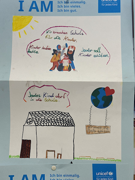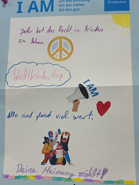 Im Rahmen des FREI DAYs haben die Kinder anlässlich des Internationalen Tag der Kinderrechte kleine „I AM“-Poster gestaltet. Hierauf hielten sie fest, welche Rechte ihnen wichtig sind, welche Wünsche sie haben und was sie einzigartig macht. Es sind bunte, fröhliche und ganz persönliche Poster entstanden, die zeigen wie vielfältig unsere Schülerinnen und Schüler sind. Die Ausstellung in der Aula macht deutlich: Jedes Kind ist besonders. Jedes Kind hat Rechte.