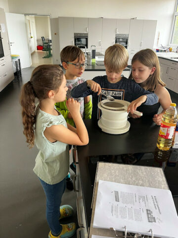 Vier Kinder aus dem 3. Jahrgang hatten beim FREI DAY eine besonders leckere Idee: Sie wollten herausfinden, warum Palmöl für die Umwelt problematisch ist – und suchten nach einer leckeren Alternative. Kurzerhand stellten sie ihre eigene Nuss-Nougat-Creme ganz ohne Palmöl her.