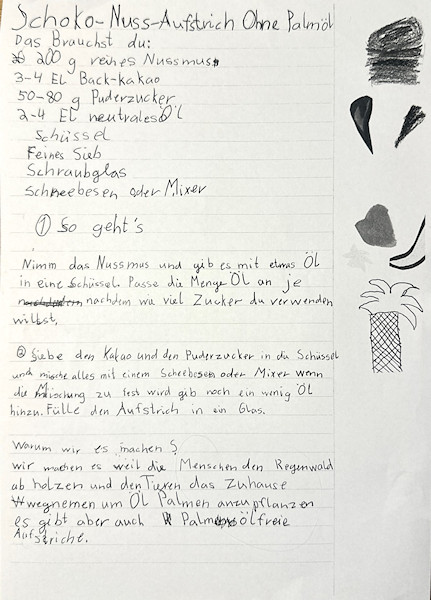 Die Kinder erklärten dazu: „Palmöl zu nutzen ist schlecht für die Umwelt, weil die Leute dann den Regenwald abholzen und den Tieren den Lebensraum nehmen. Außerdem brauchen die Menschen Pflanzen, weil Pflanzen Sauerstoff produzieren.“ Natürlich durfte die ganze Klasse die selbstgemachte Creme probieren. Alle waren begeistert. Damit auch andere Kinder unserer Schule die Creme zu Hause ausprobieren können, wurde das Rezept an alle Schüler/innen verteilt.