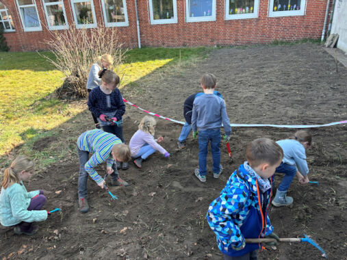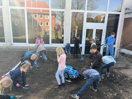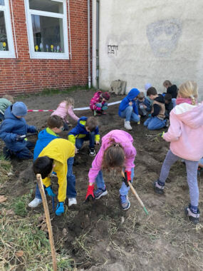 Der 2. Jahrgang hat auf der Schmetterlingswiese gewerkelt. Netterweise gab es Eltern, die mit ihren GerĂ€tschaften schon den Boden vorbereitet haben, so dass die Kinder mit ihren Hacken gut den Boden lockern konnten und die restlichen GrasbĂŒschel herausgeholt haben. Danach wurde gesĂ€t. Passend zu den Zielen „MaĂnahmen zum Klimaschutz“ und „Leben an Land“ wird dort eine bunte Wildblumenwiese erblĂŒhen. Im FREi DAY beschĂ€ftigt sich eine Gruppe von Kindern mit Hummeln und Schmetterlingen und recherchiert, was diesen Tieren gut tut und wie sie uns und unserem Planeten – unserem Zuhause – gut tun. đ đŠ đ