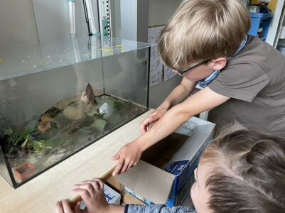 Die 2a hatte besondere Klassentiere zu Besuch. Für ca. 10 Tage konnten die Kinder 5 Weinbergschnecken in einem alten Aquarium beobachten. Außerdem richtete jedes Kind ein eigenes Schneckenglas ein und wir machen mit den kleinen Haustieren viele Versuche. Können Schnecken riechen, können Schnecken gut sehen? Was fressen Schnecken gerne und wie bekommen sie Luft?