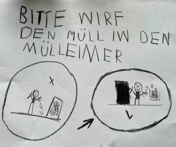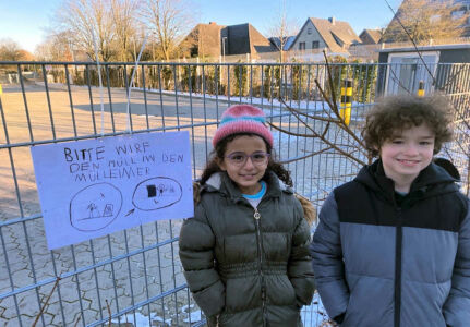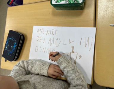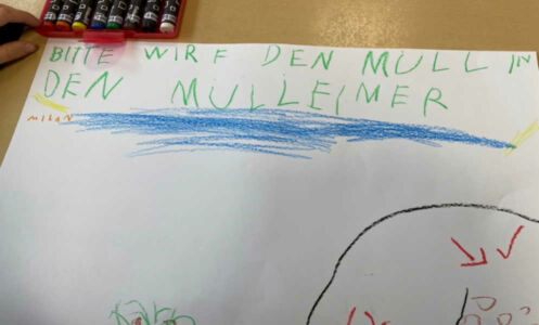 Die Vermüllung des Weges hat die Klasse ziemlich überrascht und führte dazu, dass sie aus eigenem Antrieb Plakate gemalt haben, die am Zaun neben dem kleinen Weg aufgehängt wurden.