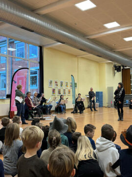 Lieber Bremer Philharmoniker (mit dem Horn), mein Name ist Frederik und ich möchte dir nochmal von unserer Projektwoche „Bilder einer Ausstellung“ berichten. […] Es haben 280 Kinder daran teilgenommen. Am 24. Januar gab es eine Aufführung zu allen 10 Bildern, die Viktor Hartmann gemalt hat mit eurer wundervollen Musik von Modest Mussorgskij, die ihr auf dem Horn, auf der Klarinette, Querflöte, Oboe und Fagott gespielt habt das war toll!