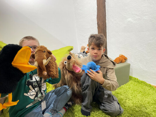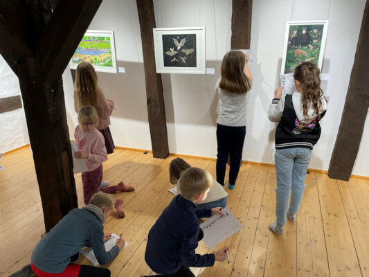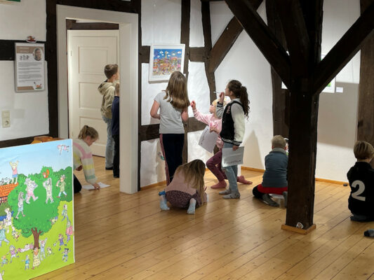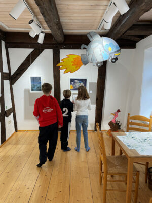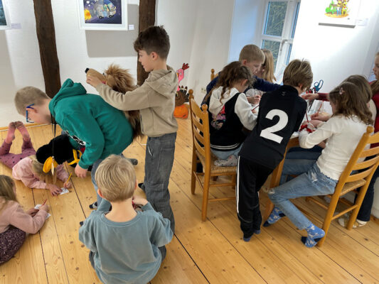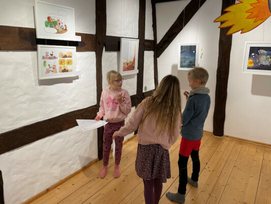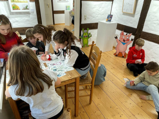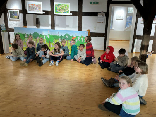 Die Ausstellung „Wimmelwelten und witzige Wesen“ von Valeska Scholz begeisterte am Donnerstagnachmittag die Klasse 3a. Freundlich empfangen wurden wir durch zwei Mitarbeitende der Gemeinde Weyhe, die für uns die Tür der Wassermühle Sudweyhe zur Ausstellung geöffnet haben und für uns ein buntes Programm bereithielten. So gab es einen Suchauftrag, eine Rallye und die Möglichkeit, selber eine Figur für ein großes Gemeinschaftsbild zu gestalten. Farbenfrohe und lustige Zeichnungen und Drucke ließen die Zeit schnell vergehen. Danke an die Elterntaxis. 🙂